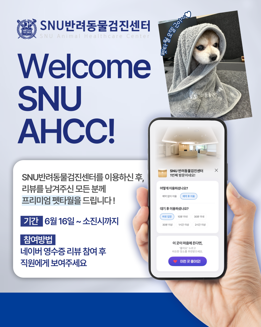 2025. 06. 16 Grand Open 🐶🐱SNU반려동물검진센터를 찾아주시는 모든 분들께 특별한 선물을 드립니다!⠀📍 참여 방법1️⃣ 네이버 예약 후 센터 이용 하고2️⃣ 네이버 영수증 리뷰 후기 작성!3️⃣ 직원에게 보여주면! 💝⠀🎁 프리미엄 펫타월 증정📅 기간: 6월 16일부터 소진 시까지⠀지금 바로 예약하고,우리 아이에게 특별한 선물도 챙겨가세요! 🐶🐱